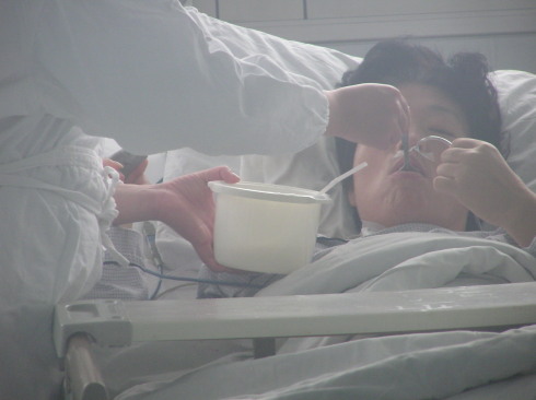 根据医嘱,陈妈妈可以喝适量的米汤来帮助尽快恢复体力,因此中午11:30,重症监护室门口就看到陈妈妈的丈夫叶国祥隔着监护门给陈妈妈送饭。看到老伴隔着玻璃门跟自己打招呼,叶国祥很激动:“昨晚就为老伴煮上了一小碗白米稀饭,老伴的胃口还不错,吃了很多。看到老伴和儿子的情况一天一个样儿,我真是太高兴了”。