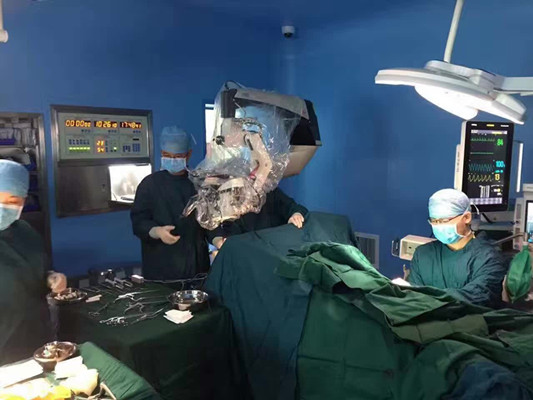 8日上午10点,神经外科雷霆教授操刀了中法新城院区的第一台手术,为一个专程从荆州转院来的48岁患垂体瘤的病人切除了肿瘤。