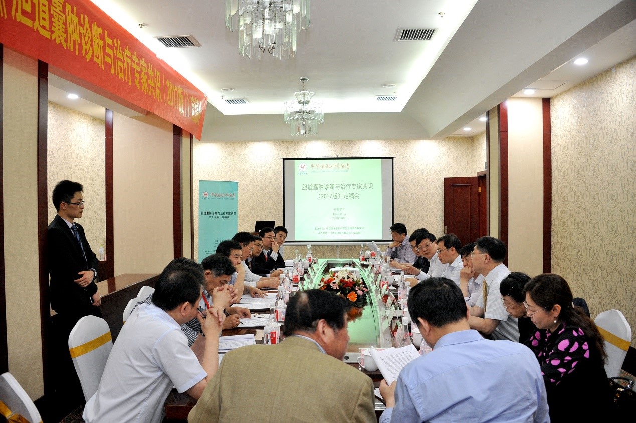 同期,中华医学会外科学分会胆道外科学组“《胆道囊肿诊断与治疗专家共识(2017版)》定稿会”成功召开,邹声泉教授、中山大学附属孙逸仙纪念医院陈亚进教授主持了讨论,讨论围绕16条诊断与治疗推荐意见逐条展开,字斟句酌,有的放矢,精益求精:包括是否纳入小儿胆管扩张症的内容、董氏分型的命名、胆管扩张症诊断与治疗流程图的精确描绘等。与会专家认真思辨,依托循证,集结经验,分享智慧,基本达成了广泛共识。董家鸿教授最后做共识定稿会总结性发言。