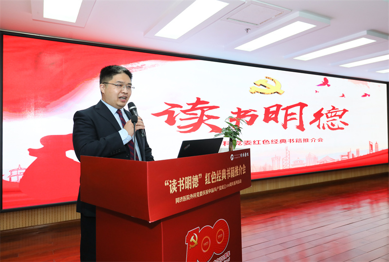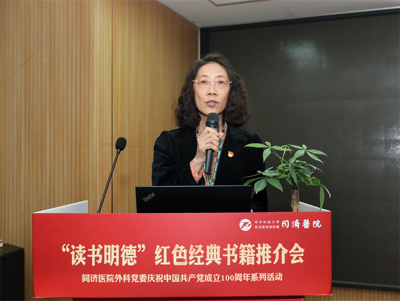 分享一本红色书籍、重温一段党史岁月,讲述一个红色故事、传承一段红色经典。为庆祝中国共产党成立100周年,深入推进党史学习教育,10月26日晚,同济医院外科党委组织开展了“读书明德”红色经典书籍推介会,以响应习总书记提出的学史明理、学史增信、学史崇德、学史力行的号召,用实际行动弘扬红色精神、传承红色基因。