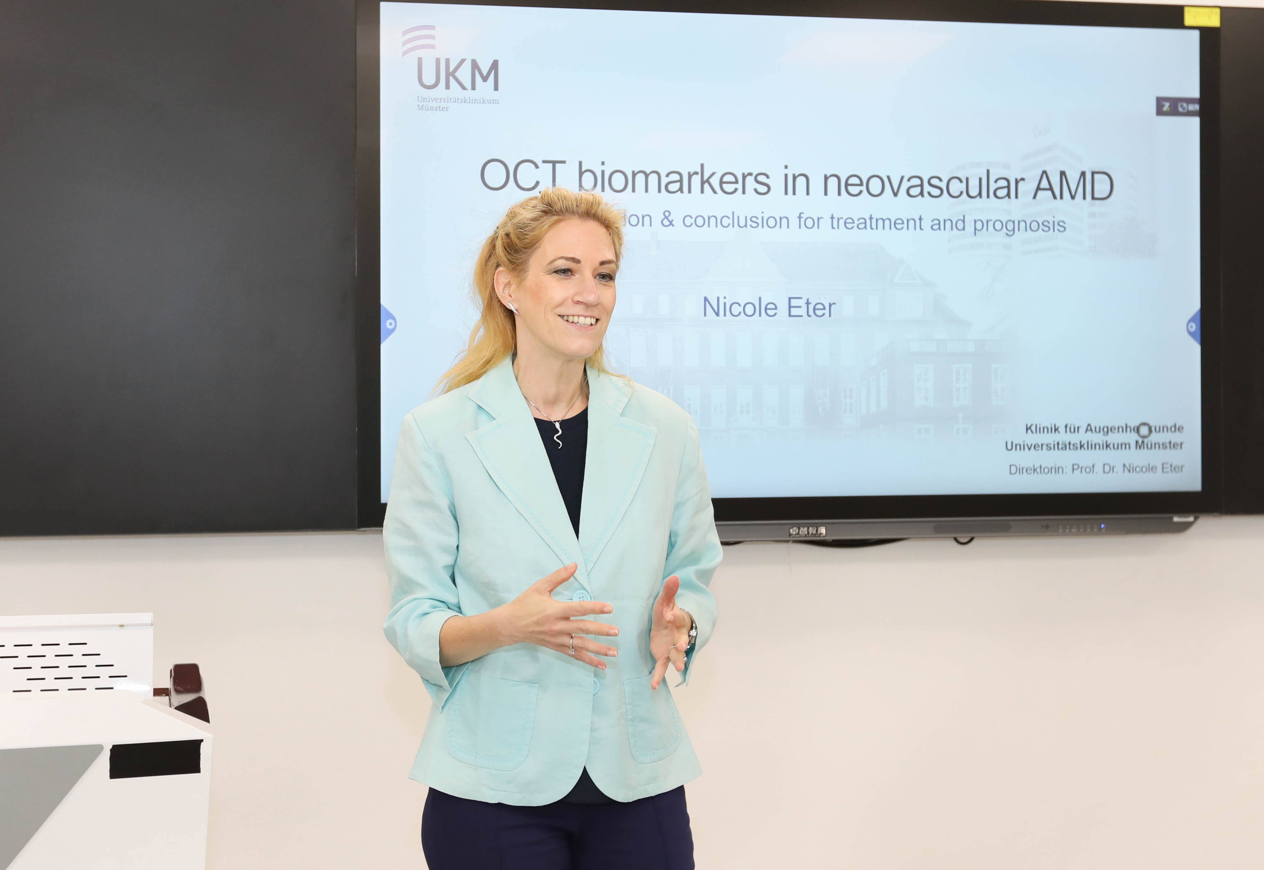 在教学楼 15 号楼 11 层智慧教室 1 举办的讲座中,李贵刚向Dr. Nicole Eter 教授全面介绍了同济医院的发展历程、学科布局及科研实力,重点展示了眼科在临床服务、科研创新和国际合作方面的最新进展。随后,Dr. Nicole Eter 教授系统阐述了影像学数据在AMD早期筛查、病程监测与个体化治疗决策中的关键价值。