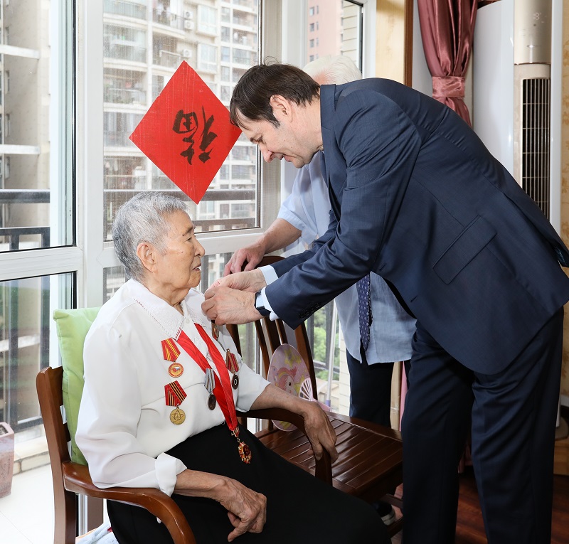 8月6日上午10点,俄罗斯驻武汉总领事馆总领事扎沃林希一行,代表俄罗斯联邦总统及俄罗斯驻华大使馆,向为苏联卫国战争作出贡献的同济医院蔡转教授,颁发“伟大卫国战争胜利80周年”纪念奖章。武汉市人民政府外事办公室李军副主任、同济医院副院长祝文涛参加颁奖活动。