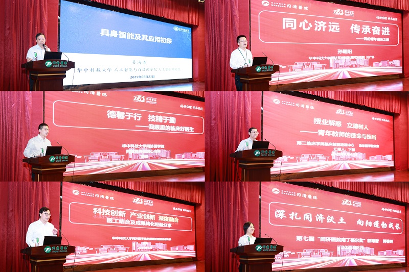华中科技大学人工智能与自动化学院副院长张海涛教授作人工智能赋能高质量发展专题报告。同济医院普通妇科主任孙朝阳教授作青年成长成才发展路径专题报告。同济医院心血管内科副主任医师苗琨作新时代青年医生责任与担当专题报告。同济医院重症医学科副主任医师卞毅作授业解惑立德树人专题报告。同济医院医工交叉研究院副院长、泌尿外科副教授凌青作医工交叉成果转化专题报告。同济医院重症医学科主管护师郭春玲作以患者为中心的人文关怀专题报告。