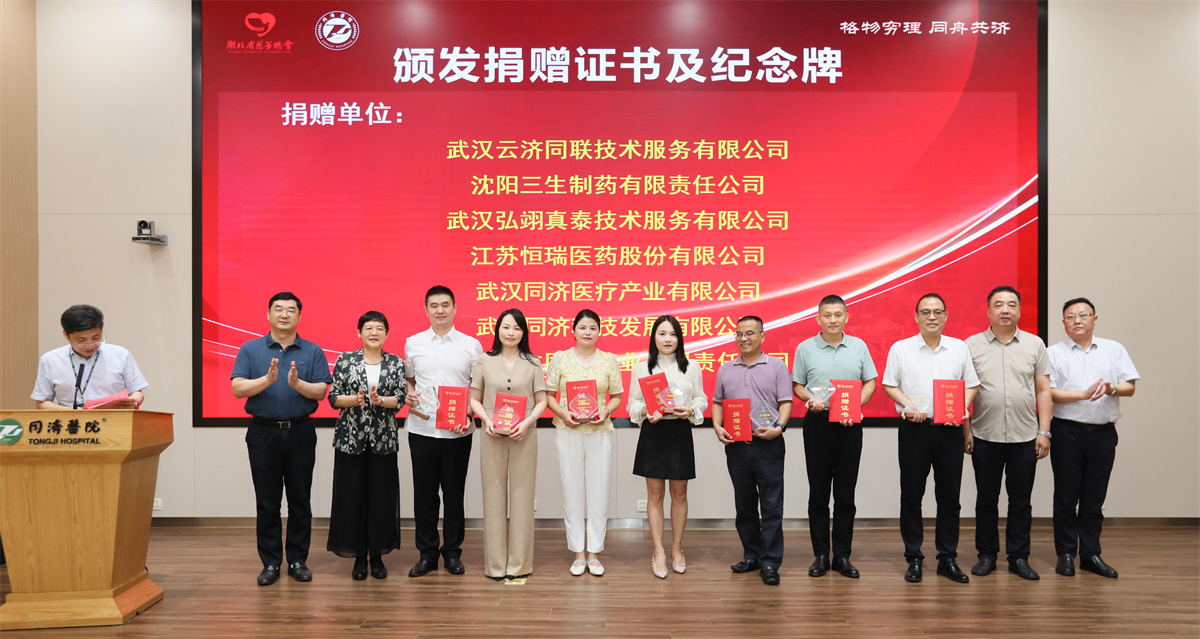招商银行武汉分行、民生银行武汉分行、武汉云济同联科技服务有限公司、沈阳三生制药有限责任公司、武汉弘翊真泰技术服务有限公司、江苏恒瑞医药股份有限公司等9家捐赠企业依次举牌捐赠,湖北省民政厅二级巡视员、湖北省慈善总会驻会副会长兼秘书长彭文洁,湖北省财政厅二级巡视员、社会保障处处长廖学东,湖北省卫生健康委员会财务处处长王劲松,同济医院党委书记唐洲平, 同济医院院长胡俊波为捐赠单位颁发捐赠证书并赠予纪念牌。