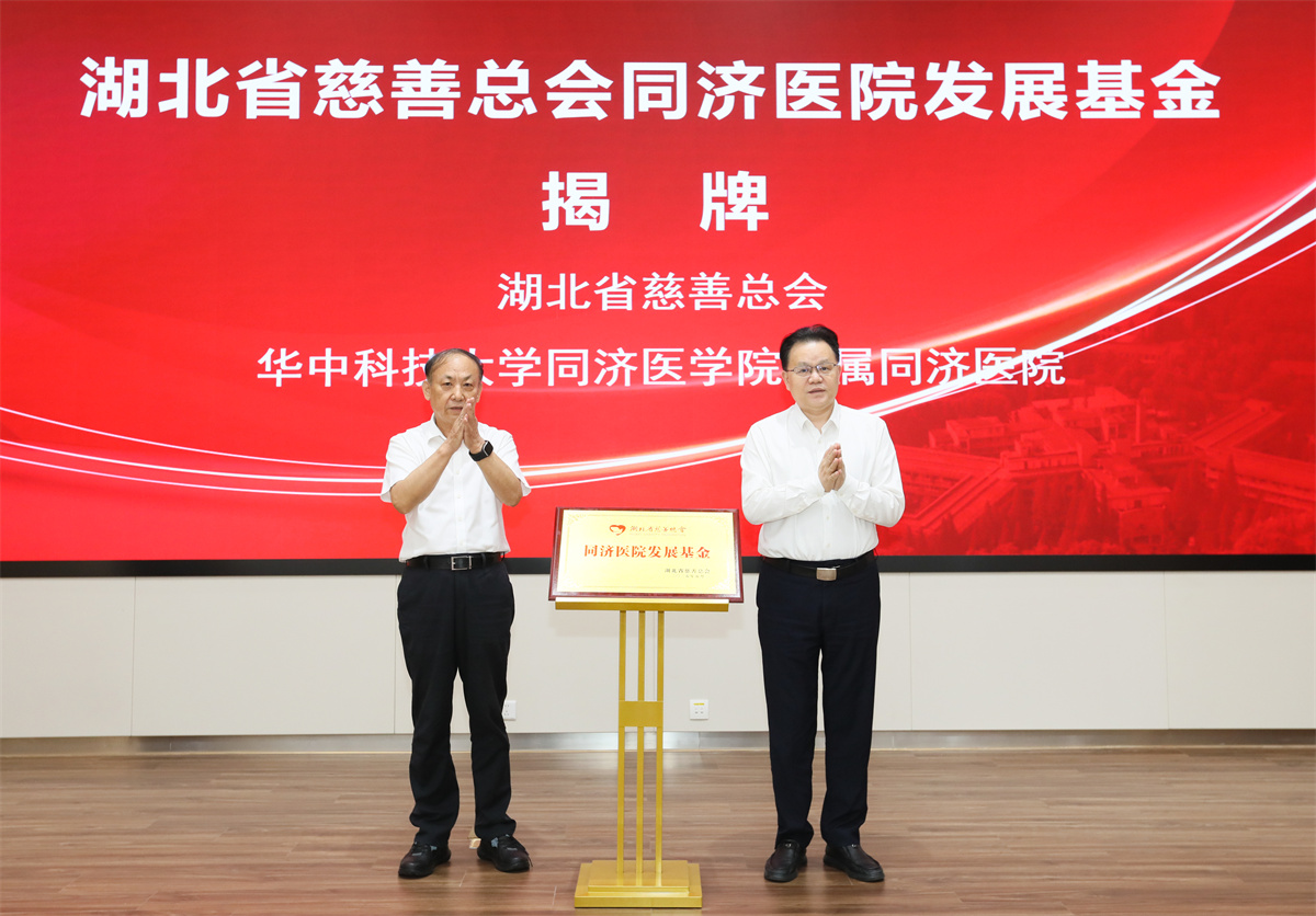 湖北省慈善总会驻会副会长郭志高与同济医院党委书记唐洲平共同为基金揭牌。