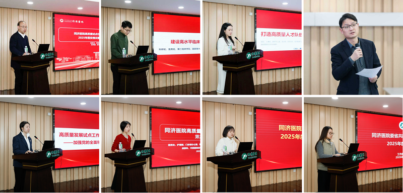 七大试点任务负责人依次汇报。试点任务一加强党的全面领导,由团委副书记姚晴雨代表工作组汇报,医院始终坚守党委领导下的院长负责制。优化形成“院党委-分党委-党总支-党支部”四级架构,夯实基层党组织建设与干部人才队伍建设。试点任务二建设高水平临床学科,由科研处处长何凡汇报。医院强化学科建设顶层设计,聚焦临床关键科学问题,完善学科发展体系。2025年印发国家重大公共卫生事件医学中心十大功能定位实施方案、持续推进人畜共患传染病重症诊治全国重点实验室的工作。2026 年将高位推进 “十五五” 学科科技创新发展规划。试点任务三开展前沿科技创新,由何凡同步汇报。2025 年医院拓展科研申报渠道,实现科研项目类型全覆盖,专利授权获批持续增长,研究成果相继发表在Cell、Nature等国际顶级期刊上,国际论文引用位列全国第二。“脑机接口” 入选 “2025 年湖北十大科技事件”,2 项成果入选 “2025 湖北十大医工交叉创新成果”。未来将构建高水平临床研究支撑体系,打造双向协同转化矩阵,争创重大科技突破策源地。试点任务四打造高质量的人才队伍,由人事处处长秦川汇报。医院将人才工作列为 “一号工程”,实行书记、院长双组长制,成立党委服务专班。以高级职称晋升为抓手,建立分类分层、破四唯重实绩的人才评价体系,完善自主评审制度,职工队伍结构持续优化。落实“两个允许”推进绩效改革,激发医教研才潜能。医学教育与师德建设全面提质,教材、课程、项目成果丰硕,住培结业首考通过率升至97.65%。2025年新增外籍院士1人,国家级人才17人。下一步将持续优化人才培养体系,提升高层次人才聚集度,充分激发人才创新活力。试点任务五实现科学化精细化管理,由涂宣成汇报。医院以智慧医院建设为抓手,构建 “三位一体” 管理模式。完成国家医学中心前沿数智中心规划,推动生物医学大数据创新应用。践行“三个结构调整”,深化薪酬绩效改革。通过强化制度建设、流程监管与11项运营管理专项工作改进,实现医疗质量与运营效率双提升,2025 年各运营结构持续优化。2026年将建设国家医学中心数智中心,持续打造智慧医院与科学管理 “同济样板”。试点任务六提供一流的医疗服务,由医务处医疗质量管理科副科长蒋海泥汇报。医院围绕功能定位、服务内涵、诊疗模式与资源下沉,取得 “夯基、优配、数智、扩容” 八大阶段性成果。通过扩增手术室资源、缩短平均住院日,提升医疗服务效率。聚焦 “看病繁” 问题,量质并重改善就医体验,打造同济服务品牌。2026 年将持续深化内涵式发展,推进特色化、国际化医疗,提升中西医结合能力,在区域医疗中心建设与分级诊疗中发挥更大作用。试点任务七强化宣传传播,由宣传部理论思政文化办公室副主任常宇汇报。2025年通过多渠道展示管理、服务、文化、科技创新成果,成功承办由中央电视台、湖北省科技厅及省卫健委主办的湖北省医疗科技成果发布会,充分展现试点工作阶段性成效。未来,将持续传播展现公立医院高质量发展实施路径与支撑体系的新探索和新成就。