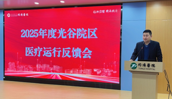 会议伊始,光谷院区医疗管理办公室主任陈瑜汇报了光谷院区 2025 年度医疗工作。陈瑜以数据为支撑,系统分析了光谷院区门诊、住院、儿童医院以及护理工作的运行情况,总结成效,指出短板,并提出针对性改进路径。