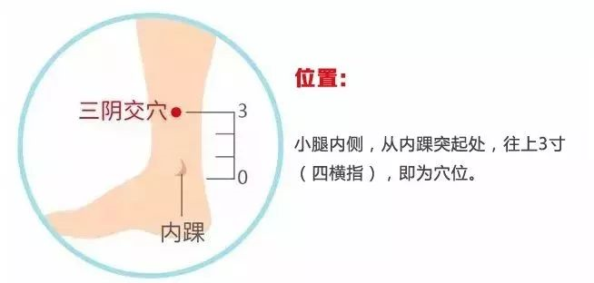 按揉三阴交穴:坐于床上,两膝关节自然伸直,用拇指指腹按于同侧的三阴交穴上,适当用力按揉1分钟,感觉以酸胀为度。