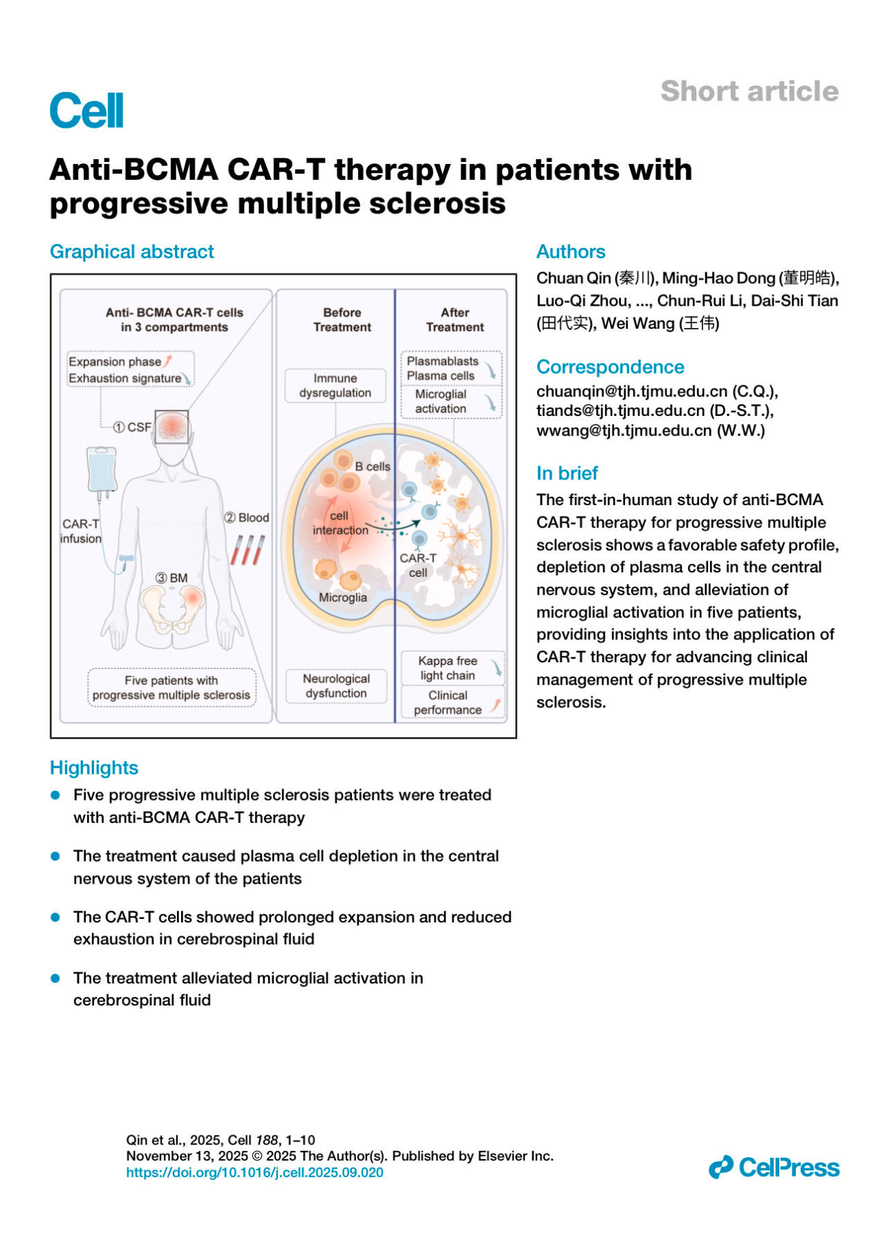 10月15日,华中科技大学同济医学院附属同济医院神经内科王伟、田代实、秦川等教授团队在国际顶尖学术期刊《细胞》(Cell)上发表重大研究成果,在全球首次证实自体靶向B细胞成熟抗原的嵌合抗原受体T细胞(CAR-T)疗法在治疗进展型多发性硬化中的安全性和有效性。