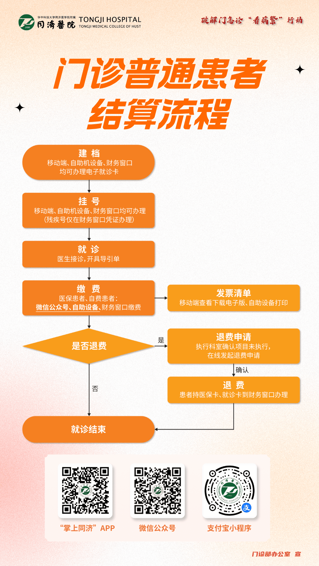 2.门诊缴费已开通医保移动支付,优先推荐微信公众号线上缴费,免排队,更便捷!