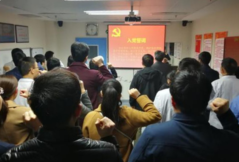 “我志愿加入中国共产党,拥护党的纲领,遵守党的章程……随时准备为党和人民牺牲一切,永不叛党!”会议开始,吴华同志带领大家,面对党旗,庄严郑重地举起右拳宣誓,集体重温入党誓词。