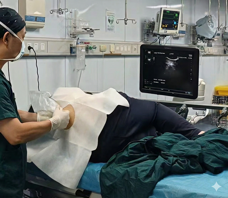 图2:医生正在进行实时超声引导下的经椎间孔穿刺操作