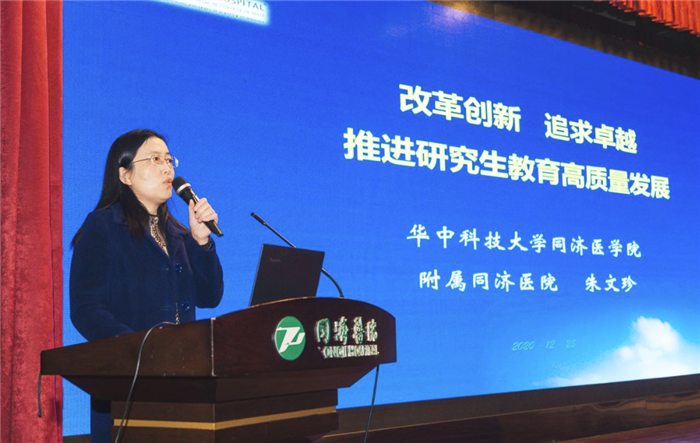 朱文珍副院长作了以“改革创新,追求卓越,推进研究生教育高质量发展”为主题的报告。朱院长从研究生教育新形势、“十三五”研究生工作总结、存在的不足、下一步工作思路四个方面进行了报告。 她传达了 习近平总书记对研究生教育作出的重要指示精神和全国研究生教育会议精神,传达了华中科技大学研究生教育改革发展大会会议精神。她强调,要认真学习、全面贯彻落实党和国家的重要教育方针,党和国家事业发展迫切需要培养大批德才兼备的高层次人才,研究生导师们肩负着培养兼备研究和创新能力的高层次人才的重要使命。同济医院高度重视研究生教育工作,以党旗领航铸魂育人,在“十三五”期间,研究生培养工作稳中有进,共授予博士学位693人,硕士学位1514人,博士和硕士毕业生每年总就业率分别为99.31%和97.31。研究生管理工作改革不断深化,导师队伍不断提升,过程管理不断完善,学位点建设成效显著,更多研究生走上国际讲台。疫情期间,同济医院研究生勇敢担当,抗疫报国,研究生培养硕果累累。同时,我们也要重视在人才培养定位、各级责任落实、育人体系建设、学术规范建设上的不足,理清培养质量、供需矛盾、导学关系、导师责任、研究生心理健康的难点,坚持“四为”方针,结合教育部发布的“1+4”研究生教育系列文件,围绕立德树人、服务需求、提高质量、追求卓越的“一条主线”,紧跟华中科技大学制定的“121”计划,确保研究生培养工作保质保量、做细做精。她强调办好研究生教育意义重大,影响深远。我们要以习近平新时代中国特色社会主义思想为指导,聚焦立德树人根本任务,认真践行为党育人、为国育才的初心使命,凝聚共识,改革创新,培养卓越医学人才,为“双一流”建设作出更大贡献。最后她真诚感谢各级领导对研究生教育的重视,感谢导师们对研究生培养的辛勤付出。