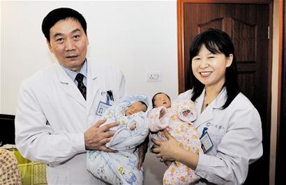 图为:乔福元教授和冯玲教授抱着龙凤双胞胎