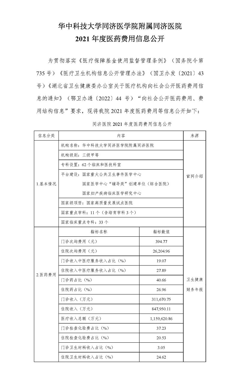 华中科技大学同济医学院附属同济医院2021年度医药费用信息公开