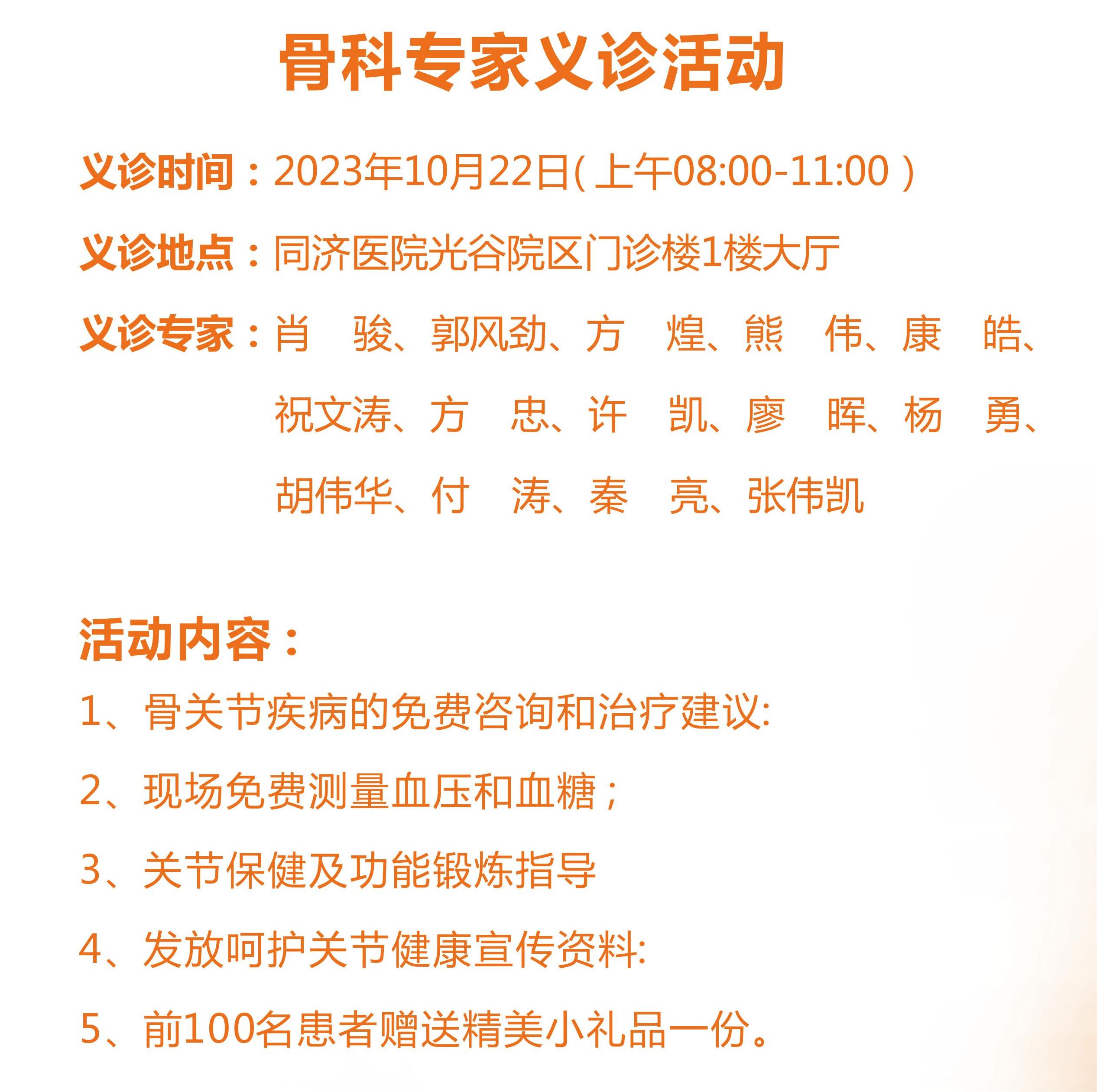 10月22日上午8:00-11:00在同济医院光谷院区门诊大楼举办“关爱骨骼 幸福生活—2023全国骨病大型义诊活动。”