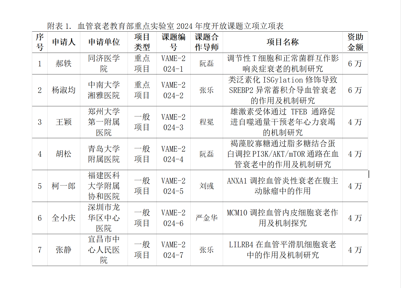血管衰老教育部重点实验室2024年度开放课题立项的通知