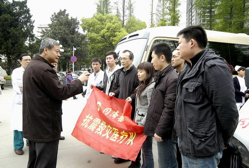 15日下午5时15分,同济医院首批医疗救援队随湖北省卫生厅组建的医疗队启程奔赴青海震区。首批救援队共7名医护人员,1辆救护车随队,预计最快17日早晨抵达震区玉树县。同济医院副院长徐永健及医务处、护理部、外科等科室负责人前往送行。