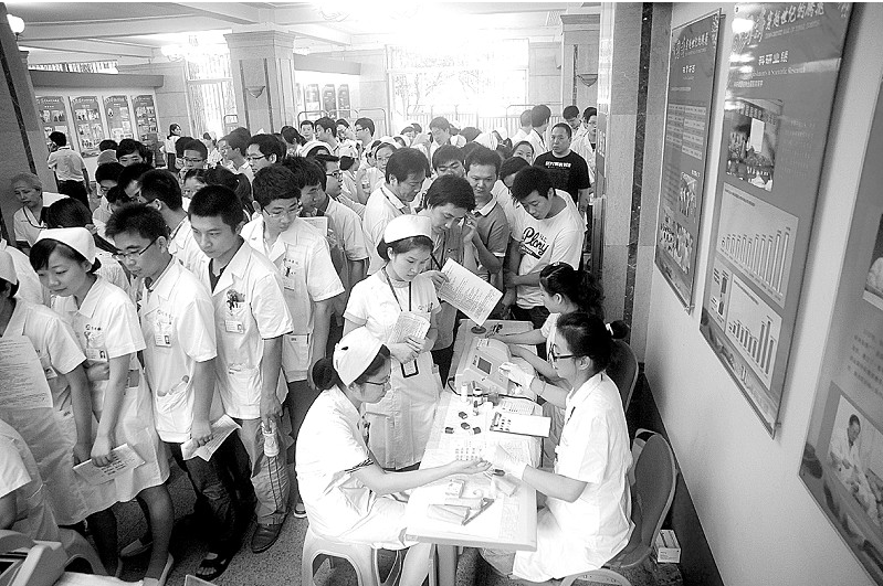 昨日,武汉同济医院医务人员参加无偿献血,1545位报名者中,673人体检合格成功献血。他们中,有的刚下手术台还来不及脱下工作服;有的刚从外地出差赶回;有的还要急着去给病房查房。2011.9.14 湖北日报