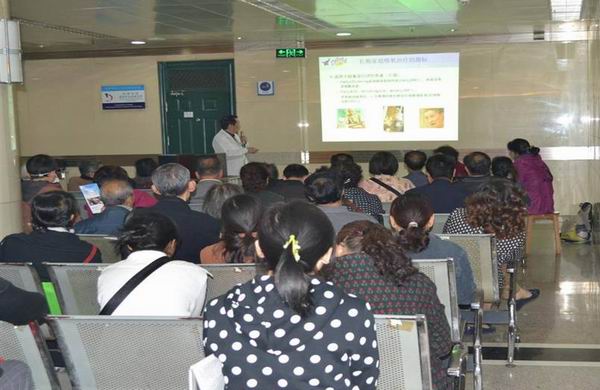 义诊活动当天,呼吸内科张珍祥教授首先以讲座的形式向大家讲解慢性阻塞性肺疾病的理论知识,告诉大家什么是慢性阻塞性肺疾病,有哪些危害,在我们生活中哪些原因会导致此病的发生发展以及如何进行自我发现和自我管理。同时告诉大家COPD是可以预防和治疗的,坚定了大家治病的信心。张珍祥教授的讲课深入浅出,结合病例,通俗易懂,辅以醒目形象的图片,一目了然,受到病人的好评。