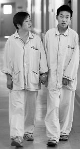 手术前樊红母子在医院里散步,紧牵手互相鼓励。
