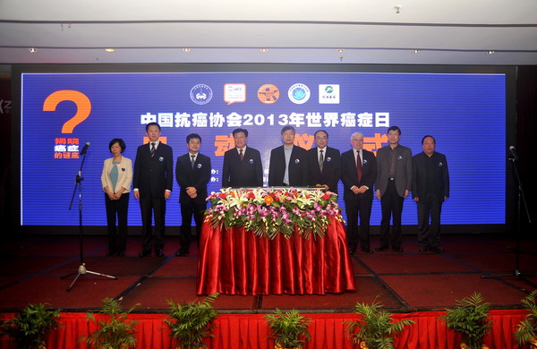 2013年世界癌症日启动仪式由中国抗癌协会主办,中国抗癌协会癌症康复与姑息治疗专业委员会,华中科技大学同济医学院附属同济医院承办,武汉市医学会肿瘤专业委员会,湖北省抗癌协会,湖北省肿瘤学会协办。中国抗癌协会理事长,中国工程院院士 郝希山教授,中国工程院院士,华中科技大学校长李培根院士,中国工程院院士,中国抗癌协会副理事长于金明院士,中国抗癌协会秘书长,天津医科大学肿瘤医院副院长王瑛教授,卫生部疾病控制局慢病处吴良有处长,WHO驻华代表蓝睿明博士,湖北省卫生厅张瑜副厅长,湖北省抗癌协会理事长陈焕朝教授,华中科技大学同济医学院附属同济医院副院长王伟教授,华中科技大学同济医学院附属同济医院肿瘤中心主任,中国抗癌协会癌症康复与姑息治疗专业委员会主任委员于世英教授,中国抗癌协会副秘书长,原全军肿瘤内科诊断治疗中心主任刘端琪教授,中国癌症基金会控烟与肺癌防治工作部主任,中国抗癌协会科普宣传部部长支修益教授,湖北省抗癌协会副理事长、省肿瘤医院院长魏少忠教授,华中科技大学同济医学院附属同济医院马丁教授,周剑锋教授等四十余名肿瘤学界专家,100余名肿瘤科医疗人员及300余名肿瘤患者出席大会并参加各项活动。中国抗癌协会秘书长,天津医科大学肿瘤医院副院长王瑛教授主持会议。