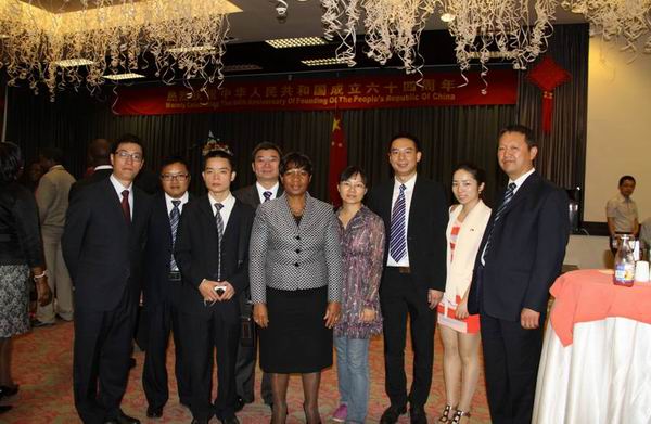 9月的莱索托(非洲南部)正值春暖花开、芳草茵茵的季节,9月26日庆祝中华人民共和国成立64周年宴会安在Maseru Sun Hotel举行。大厅播放着中国民族音乐,洋溢着浓郁的节日气氛。会议由中华人民共和国驻莱索托大使胡定贤主持。到会的有莱索托代理外交大臣兼通讯及科技大臣莫科西、妇女及青体大臣马塞里巴尼、能源及水务大臣塔哈尼、旅游及文化大臣拉得比、法律及宪法事务大臣帕佛罗、司法及教化大臣蒙尼亚克、卫生大臣马纳莫莱拉、副大臣马克伊、内政大臣莫拉波、教育部副大臣拉泽勒、国防军司令、代理警察总监、参议院副议长、马塞卢市长、前副首相莱霍拉及参、众议员等政要,外国驻莱使节及国际组织代表,以及华侨华人代表和中资机构负责人等各界人士260余人。