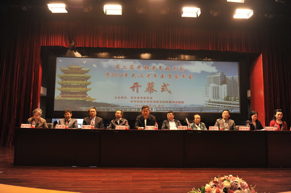 大会执行主席华中科技大学同济医学院附属协和医院管思明教授主持开幕式,大会执行主席张存泰教授致欢迎辞并回顾了同济医院老年医学科的成长历程和取得的成绩。同济医院吴华副院长、武汉医学会何向军秘书长、湖北省保健委员会办公室李伟主任、中华医学会老年医学分会前任主委王建业教授分别致辞,湖北省卫生与计划生育委员会党组书记杨有旺也给大会发来贺信,对各位到会专家学者表示欢迎,对同济医院老年医学科成为国家重点临床建设专科、湖北省老年病防治与保健医学临床研究中心、湖北省全科医学培训基地、国家老年病药物临床试验基地等一系列成绩予以肯定,并预祝大会圆满成功。中华医学会老年医学分会候任主委于普林教授、同济医院冯克燕教授、武汉大学人民医院老年科主任朱刚艳教授、武汉大学中南医院王桦教授参加了大会开幕式。来自国内老年医学领域顶级专家和中部地区老年医学工作者500余人参加了本次盛会。