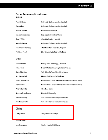 美国放射学院(ACR)前列腺肿瘤影像诊断指南(ACR PI-RDAS)是国际放射学界公认的最权威的前列腺肿瘤影像诊断指南,是美国和国际一流医院放射科普遍采用的前列腺肿瘤影像诊断规范和管理规程。该指南的撰写人是美国放射学界具有深厚临床资历和卓著学术成就的著名放射科医师,并邀请其它国家优秀放射科医师参加撰写,新版指南遴选了八位欧洲放射科医师、一位大洋洲放射科医师、一位亚洲放射科医师参加撰写。