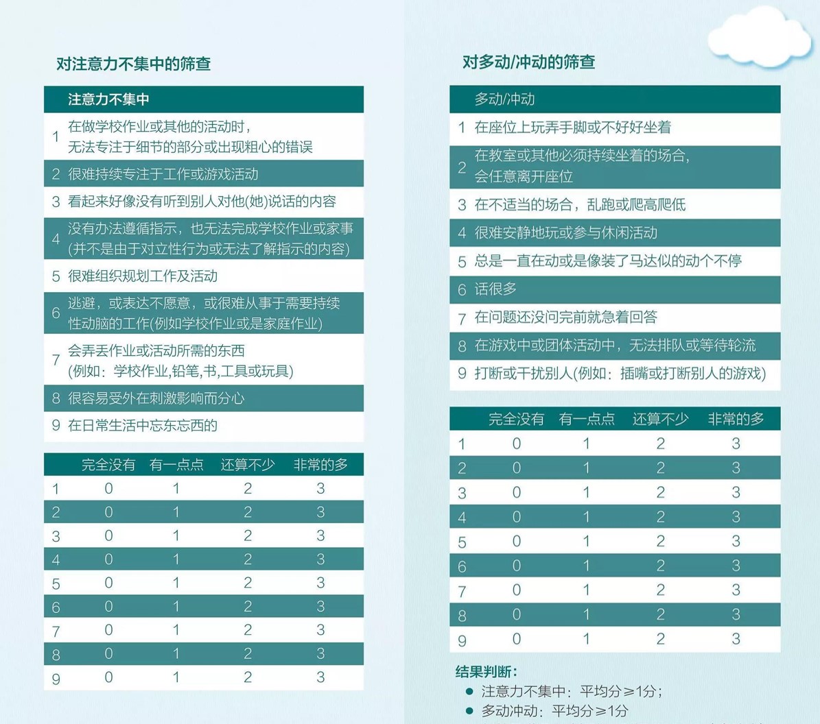 怎么判断孩子是不是患上了“ADHD”呢?有一个简单的筛查工具可以使用:SNAP-IV(附表)。如果筛查结果满足:注意力不集中平均分≥1分、多动冲动平均分≥1分,则怀疑ADHD。但由于结果往往比较主观,不够准确,所以还是要及时到正规医院寻求专科医生的帮助,以进一步明确诊断。