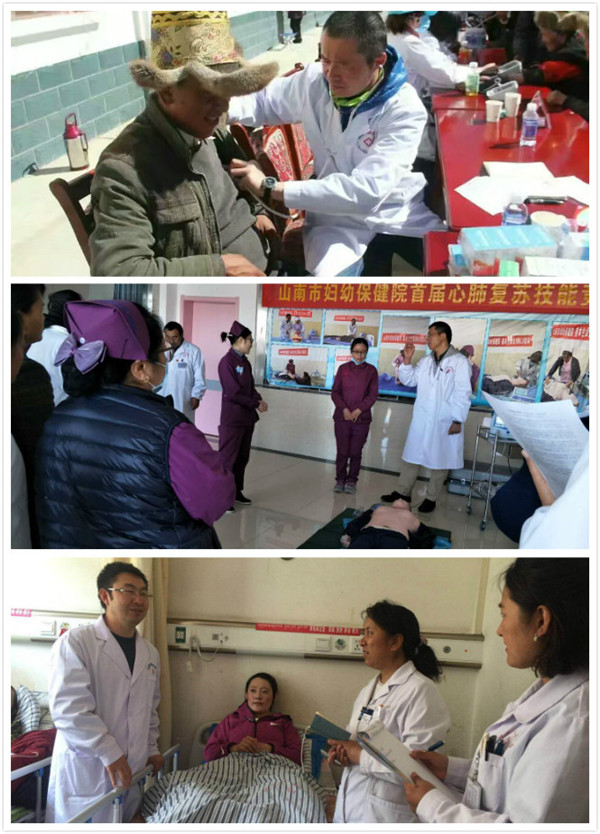 (韩东吉、陈明兵、吴明富在临床一线为西藏当地群众提供医疗服务的照片)