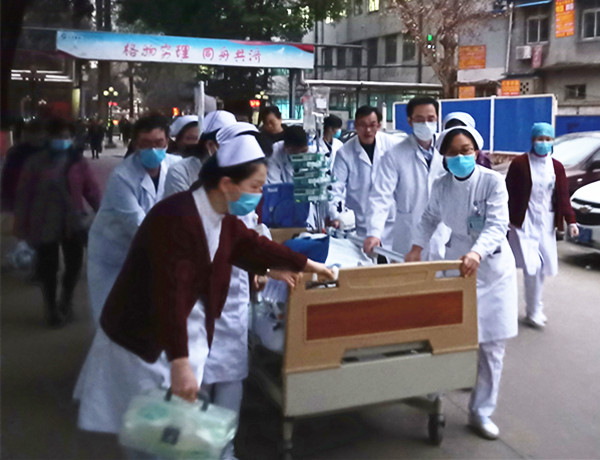 转运车前,王教授仔细核对病人姓名并大声唱读,笑着说:“今天也体验了一把护士的三查七对。”廊道里,刘教授与护士小季将转运病人的病床快速还至老病房。这一次搬迁就在如此一动一静,严肃与诙谐中进行。