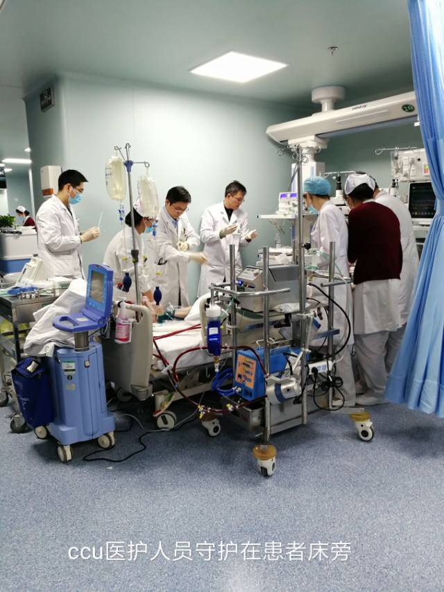 心内科副教授周宁小跑着赶到心内科重症监护室时,梦姚血压已经低到完全测不到了,心电监护显示她的心跳达到180-200次/分,是致命性的室性心动过速心律,而触诊心跳极其微弱,心脏功能极度衰弱,整个人处于休克状态......结合病史、症状、体格检查、血液检测与心电图结果,根据同济医院汪道文教授牵头制定的“成人暴发性心肌炎诊断与治疗中国专家共识”,周宁迅速确立了暴发性心肌炎的诊断,立刻联系麻醉科行气管插管呼吸机辅助通气、肾内科行床边血液滤过,同时启动“以生命支持为依托的综合救治方案”。心内科副主任医师徐昶与周宁分工合作,在病床边行主动脉内球囊反搏植入,梦姚的血压仍维持不住。随即周宁又马上为她进行ECMO(体外膜肺氧合系统)植入,血压总算稳定在80/50mmHg左右......