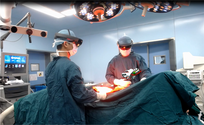 MR技术是将患者病灶的虚拟3D影像投射到手术区域中,实现虚拟世界和现实世界信息互通的技术。患者的病灶模型和假体,可以利用MR设备进行实景立体播放,弥补了影像学片子无法现场立体成像的缺陷。术前患者及其家属可以像看电影一样了解病情和手术方案,术中医生戴上MR眼镜通过手势操作三维影像的移动、缩放,适配患者的体位,划定肿瘤的边界和切除范围,医生不再完全依赖于想象力做手术,真正做到边看边做,心中有数。