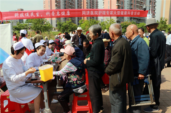 2019年5月9日,在“5.12”国际护士节来临前夕,同济医院光谷院区党工委组织20余名党员专家前往东湖新技术开发区九峰街景源里社区开展特色党日活动,为社区居民和社区卫生服务中心医务人员提供健康宣教和业务指导。