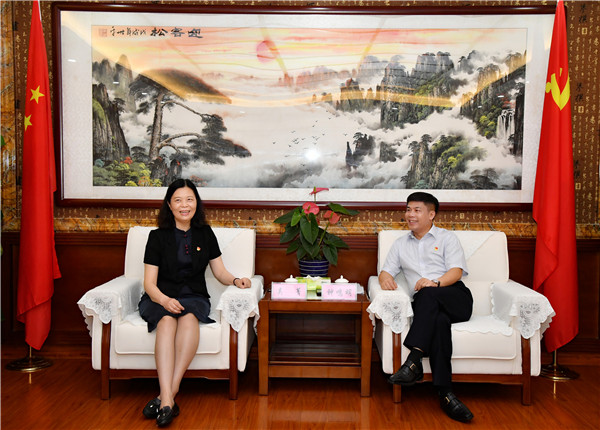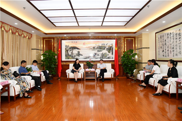 同济医院党委书记吴菁(左一)与文昌市委书记钟鸣明(右一)进行座谈交流