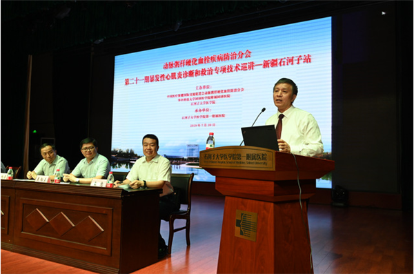 7月20日,为深入推广暴发性心肌炎的诊治规范,全面提高急危重症的救治水平,同济医院汪道文教授带领团队一行7人来到新疆石河子市,举办“第二十一期暴发性心肌炎的诊治专项技术全国巡讲——新疆石河子站”学习班。此次巡讲由中国医疗保健国际交流促进会、同济医院、石河子大学医学院共同主办,石河子大学医学院第一附属医院承办。石河子大学党委副书记郑旭荣、石河子市卫生健康委员会主任姬长海、石河子大学医学院院长兼石河子大学医学院第一附属医院党委副书记吴向未、石河子大学医学院副院长左后娟出席会议开幕式,石河子市内各级医院代表、各级医学研究生等近400余人参加本次会议。
