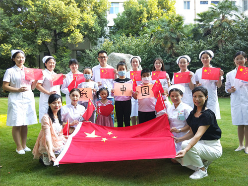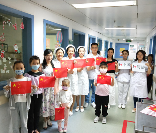 爱国要从娃娃开始。9月27日,在新中国70华诞即将到来之际,同济医院儿科血液病专科的医护人员与硚口区民进的优秀老师们一起教住院的小患们唱国歌,手工制作国旗,并给孩子们讲述国旗和国歌的来历。孩子们拿着自己绘制的国旗,开心的合影,深情表白我们可爱的祖国!