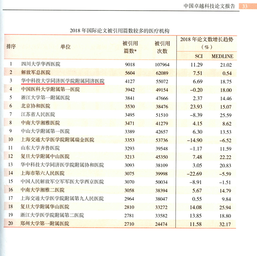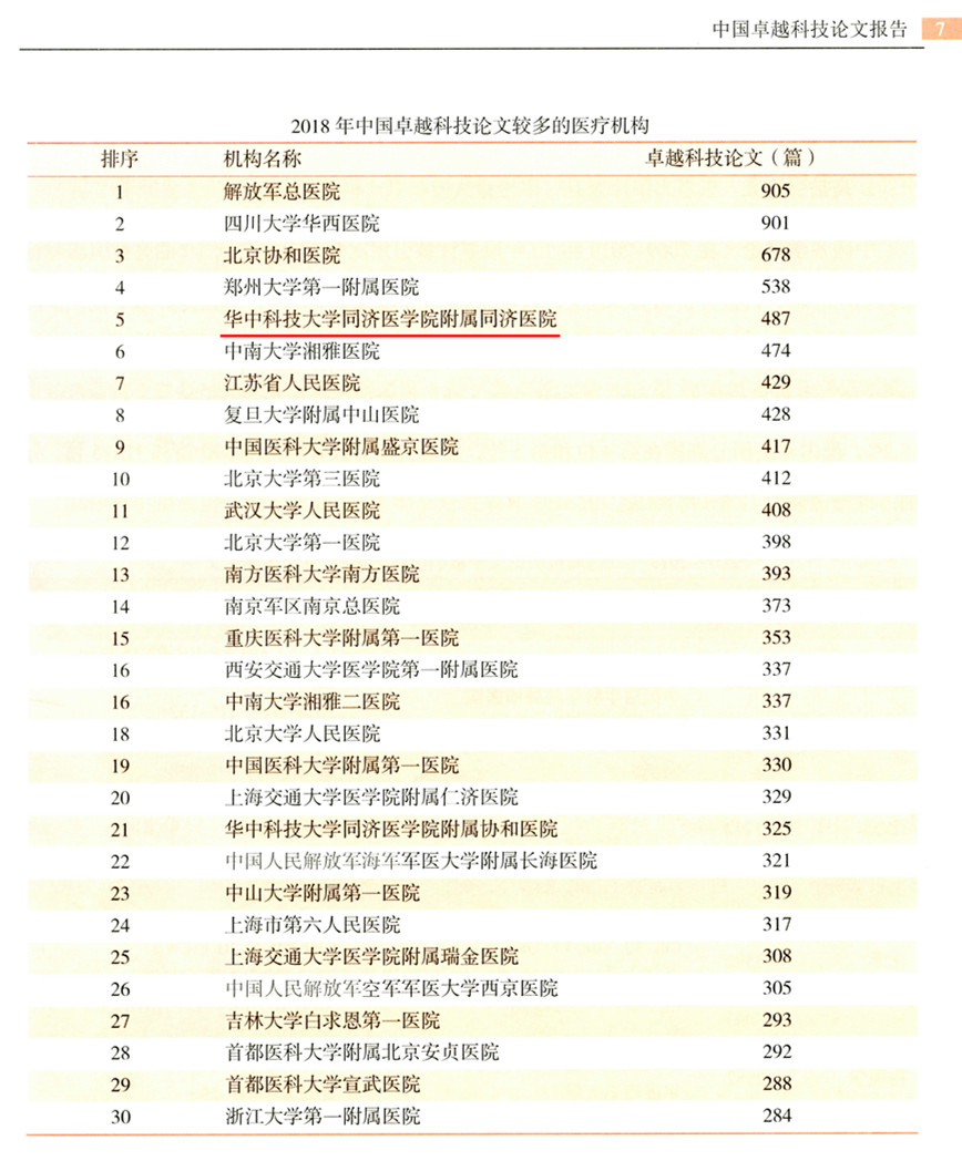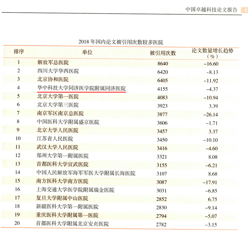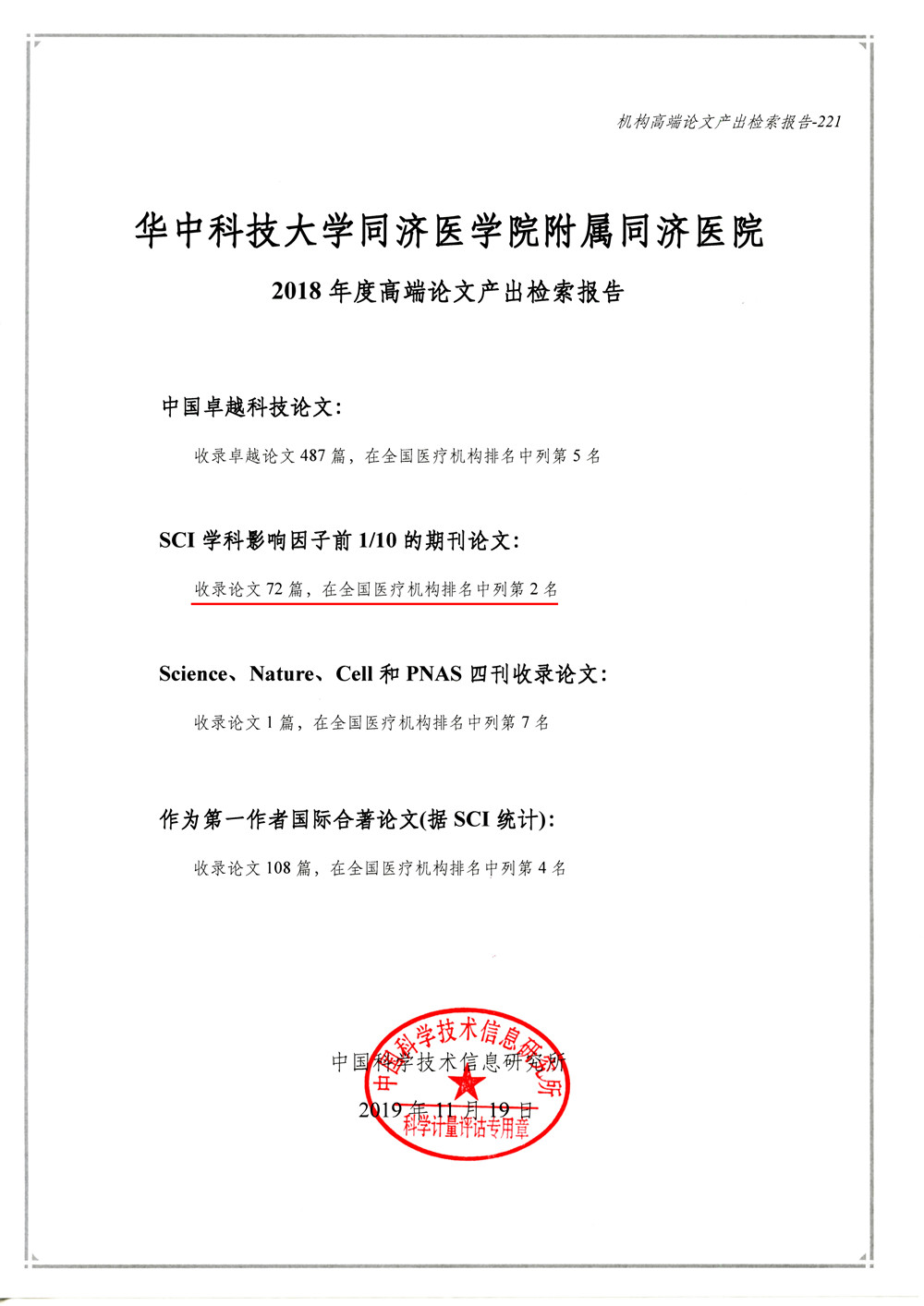 11月19日,中国科学技术信息研究所发布了2018年中国卓越论文产出报告,华中科技大学同济医学院附属同济医院国际顶级期刊发表研究论文数量(SCI学科影响因子前1/10的期刊论文)在全国医疗机构中排名第2位。近几年同济医院围绕临床重大疾病做研究;满足人民健康需求,做出健康中国实实在在的“立地”成果,得到国际同行的认可。