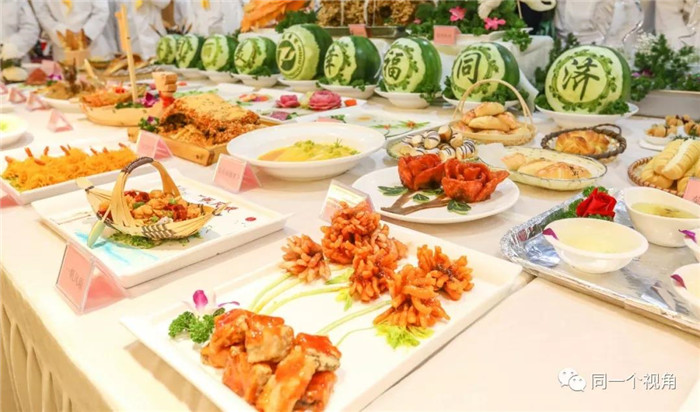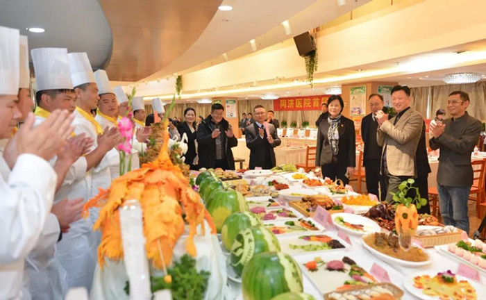 下午3时,营养餐厅内音乐悠扬、香飘四溢,各类鲜果、咖啡、西点、特色菜肴等分布在各个展台上,刻有“美丽同济 幸福同济”、院徽等造型图案的精美食品点缀其中,“肴香鹤舞”、“江山如画”、“花开富贵”、“盛世中华”等一道道入眼胜画的美食更是巧夺天工,这场富有中华美好意蕴又兼具极大观赏价值的美食盛宴吸引了每一位入场评委及嘉宾交口称赞、驻足拍照。