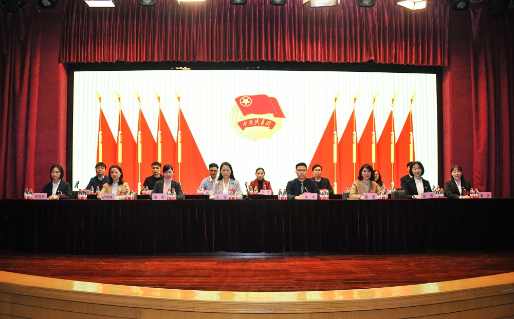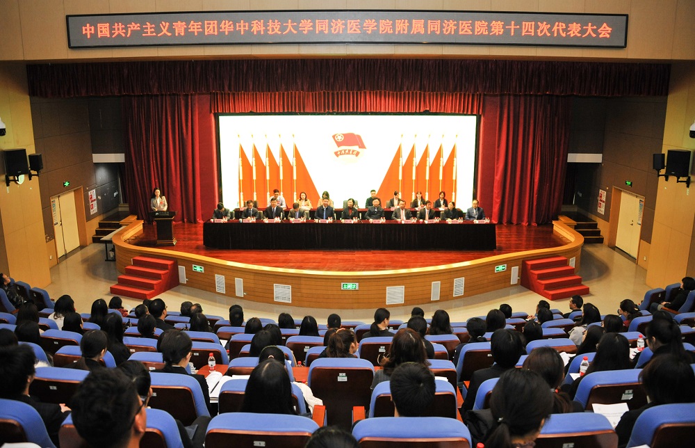学术报告厅气氛热烈,主席台上方悬挂着“中国共产主义青年团华中科技大学同济医学院同济医院第十四次代表大会”的会标,后幕正中悬挂的团徽熠熠生辉,10面鲜艳的红旗分列两侧。行政楼一楼大厅电子屏播放着“热烈庆祝共青团华中科技大学同济医学院附属同济医院第十四次代表大会胜利召开”的标语。