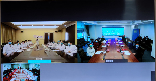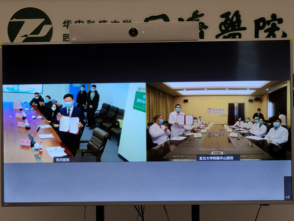 3月30日下午3点,上海复旦大学附属华山医院,华中科技大学同济医学院附属同济医院汉口院区、同济医院光谷院区进行了视频连线签约仪式。国家卫生健康委医政医管局监察专员焦雅辉,同济医院党委书记吴菁,同济医院院长王伟,华山医院党委书记邹和建,华山医院院长丁强,同济医院副院长、光谷院区院长刘继红,华山医院副院长、援鄂医疗队总指挥马昕等院领导,及医院代表等出席签约仪式。