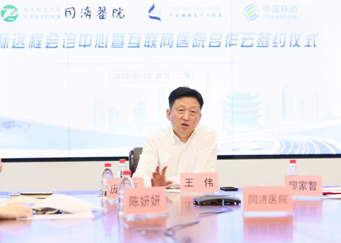 2020年6月18日,华中科技大学同济医学院附属同济医院(下文简称“同济医院”)、联仁健康医疗大数据科技股份有限公司(下文简称“联仁健康”)与中国移动通信集团湖北有限公司(下文简称“湖北移动”)在武汉、上海两地,采用三方远程视频连线的方式共同举行“国际远程会诊中心暨互联网医院合作” 云签约仪式。