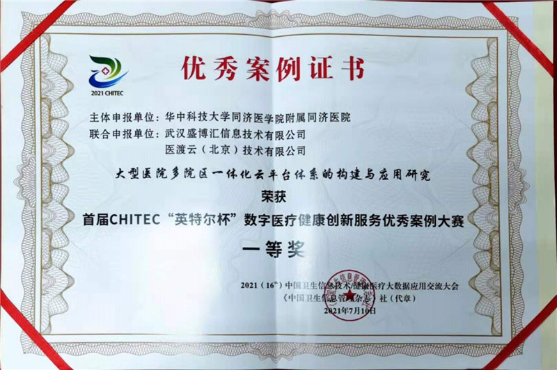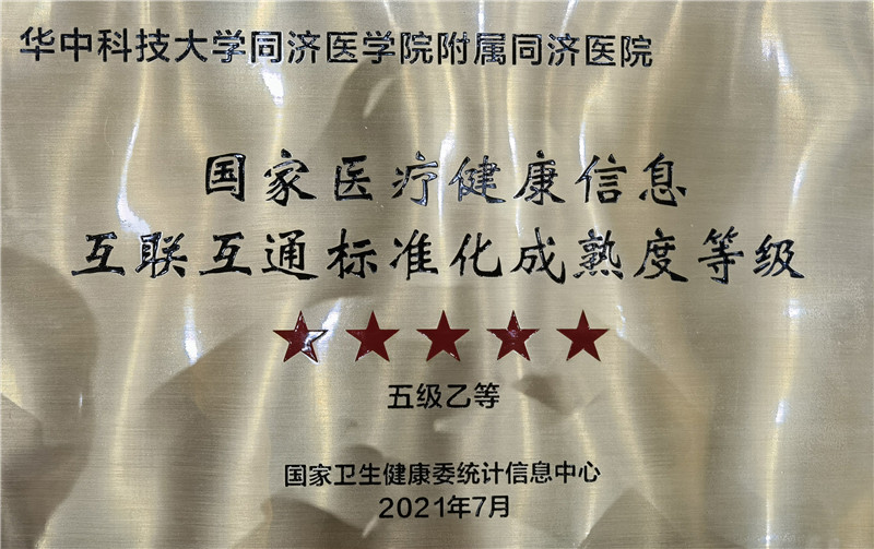 2021年7月9日至11日,2021年度中国卫生信息技术/健康医疗大数据应用交流大会(CHITEC)在武汉举办。会议开幕式上,国家卫健委发布了2020年度国家医疗健康信息互联互通标准化成熟度测评结果,华中科技大学同济医学院附属同济医院顺利通过此项测评,成熟度等级为五级乙等,成为湖北省部省属医院中首家测评结果为五级乙等的医院,也是目前通过该测评的医院中的最高级别,全国现共有32家医院获评此等级。