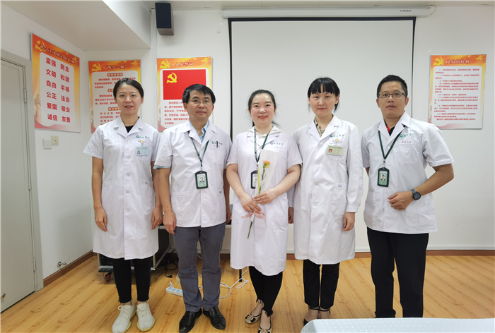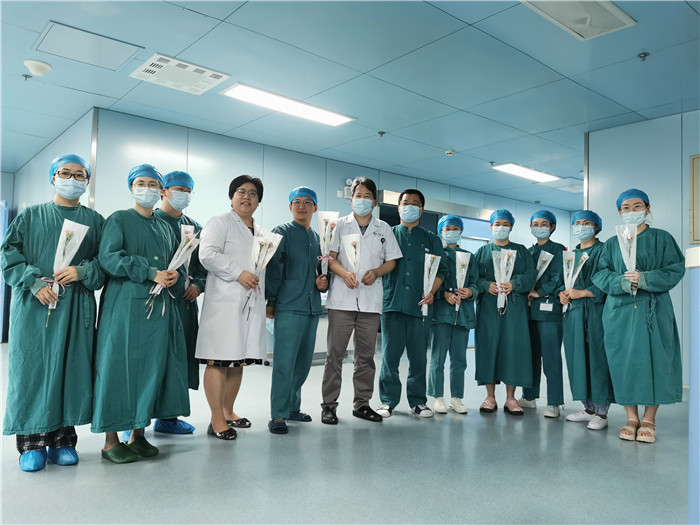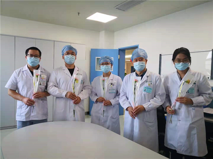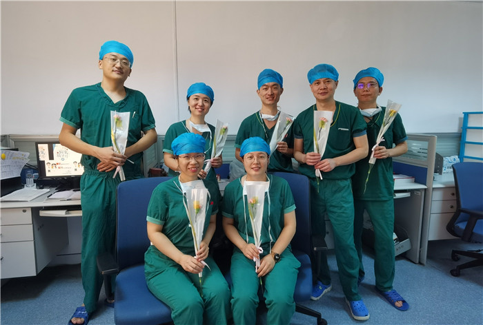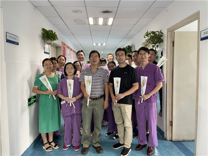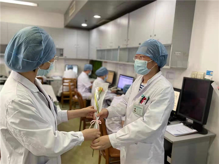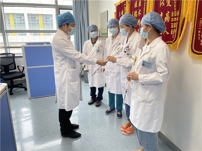 一大早,中国工程院院士、同济医院妇产科学系主任马丁正在与青年医生们探讨科研问题,医院党委书记王伟、院长刘继红敲开了门,向他献上了一捧鲜花,祝福他和在场医生们节日快乐!