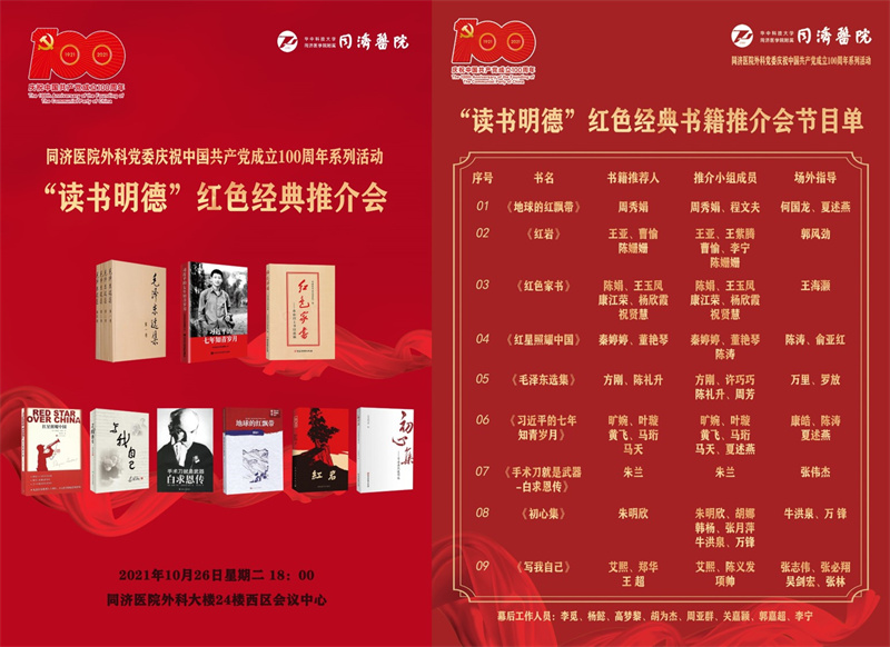分享一本红色书籍、重温一段党史岁月,讲述一个红色故事、传承一段红色经典。为庆祝中国共产党成立100周年,深入推进党史学习教育,10月26日晚,同济医院外科党委组织开展了“读书明德”红色经典书籍推介会,以响应习总书记提出的学史明理、学史增信、学史崇德、学史力行的号召,用实际行动弘扬红色精神、传承红色基因。