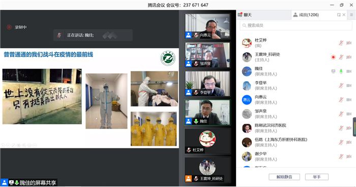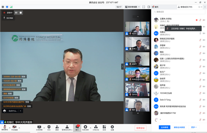 为进一步提升医院职工临床研究与转化医学研究水平,促进青年学者间学术交流,12月4日,同济医院科研处与同济医学院海外校友总会于共同举办了首届临床研究与转化医学青年专家国际研讨会。会议以线上形式召开,并对海内外校友及我院师生进行同步直播。同济医院刘继红院长、刘争副院长,郑先荣教授、唐大春教授、向惠云教授等各位同济医学院海外校友总会领导,邹声泉教授、李登举教授、张万广教授等相关专家,伍路、隗佳、谢少华、赵俊芳等青年医生代表,部分医学院海内外校友,以及同济医院各科室主任、师生和职工等共计1400余人参加了本次会议。会议由院科研处常务副处长陈刚教授主持。