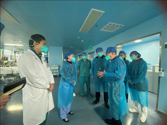 张定宇一行深入院区急诊、重症医学等科室,走访慰问奋战在医疗救治一线的医务人员,并与院区及相关科室负责人深入交流,详细了解院区目前门急诊接诊流程、门诊和住院病人收治情况、危重症病人救治及医疗资源配置等情况。