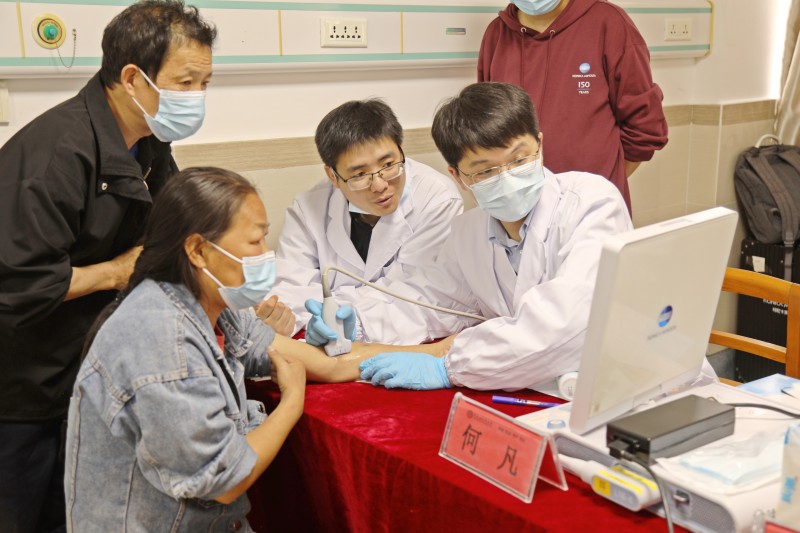 下午,徐钢教授带领医护人员到浠水县人民医院肾内科病房做教学查房,为患者详细讲解治疗方案;何凡主任医师携血液净化血管通路专业团队为浠水县人民医院肾内科患者进行血管超声评估和动静脉内瘘穿刺图谱绘制;刘柳副主任医师携医护人员到病房查看肾病病理疑难重症病例并耐心分析讲解。充分发挥同济肾内科各亚专业优势,让基层医院患者“实打实”受益。