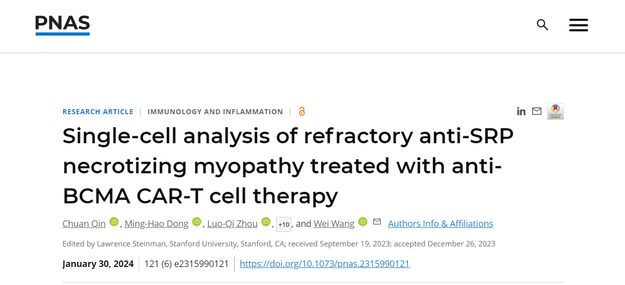 1月30日,华中科技大学附属同济医院神经内科王伟教授团队全球首次应用靶向成熟B细胞抗原(BCMA)的CAR-T细胞(CT103A)对复发难治性免疫介导的坏死性肌病进行治疗,并取得了显著的临床疗效。同时王伟团队还结合单细胞测序、免疫组库等技术对CAR T细胞治疗自身免疫性疾病的潜在分子机制和治疗后的免疫微环境重塑等进行了深入的描绘。这是王伟团队继应用CAR-T成功治疗视神经脊髓炎后在自身免疫病领域中的又一重要突破。研究论文“靶向B细胞成熟抗原(BCMA)的嵌合抗原受体T细胞(CAR-T)治疗难治性抗信号识别颗粒(SRP)抗体阳性的坏死性肌病的单细胞分析研究”也于今日在线发布在国际著名期刊《美国国家科学院院刊》(PNAS杂志)。